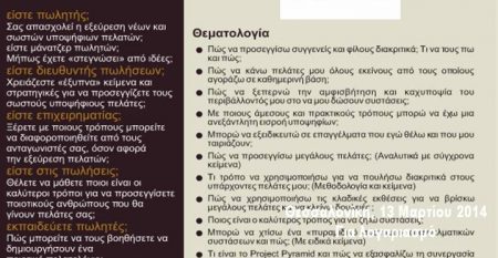αλλά πιο πολύ στο κομμάτι της επικοινωνίας.  Έχω παρακολουθήσει αρκετά σεμινάρια στο παρελθόν, με θέμα τις πωλήσεις κ όχι μόνο, λόγω οικογενειακής φιλίας με τον Κο Αντώνη Καλογήρου (life coach etc.) και  θέλω να σας πω συγχαρητήρια κ να συνεχίσετε να μοιράζετε γνώση σε αυτό τον κλάδο, που τόσο πολύ έχει ανάγκη.