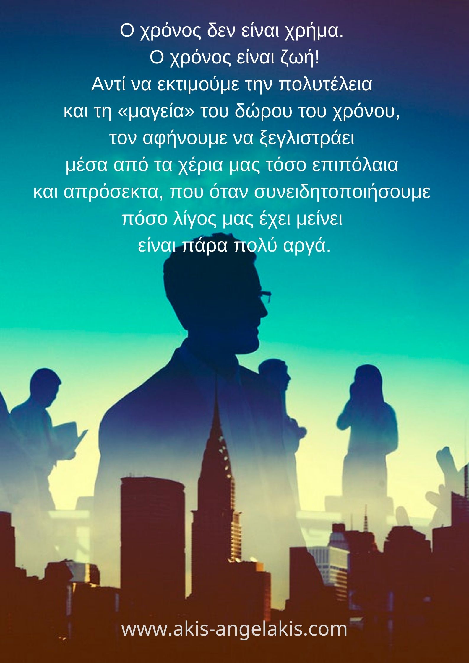 Αντί να εκτιμούμε την πολυτέλεια και τη μαγεία του δώρου του χρόνου, τον αφήνουμε να ξεγλιστράει μέσα από τα χέρια μας τόσο επιπόλαια και απρόσεκτα, που όταν συνειδητοποιήσουμε πόσος λίγος μας έχει μείνει είναι πάρα πολύ αργά.