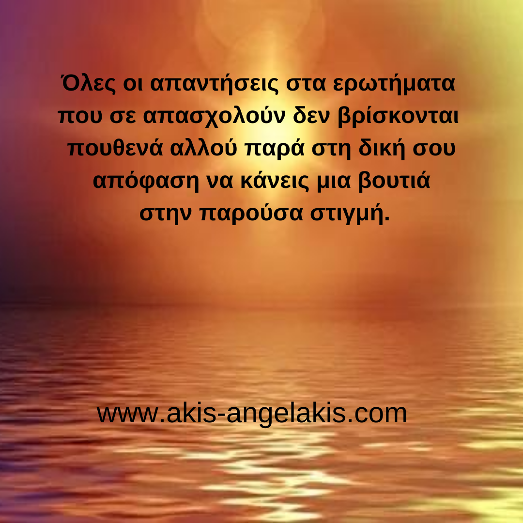 Όλες οι απαντήσεις στα ερωτήματα που σε απασχολούν δεν βρίσκονται πουθενά αλλού παρά στη δική σου απόφαση να κάνεις μια βουτιά στην παρούσα στιγμή.