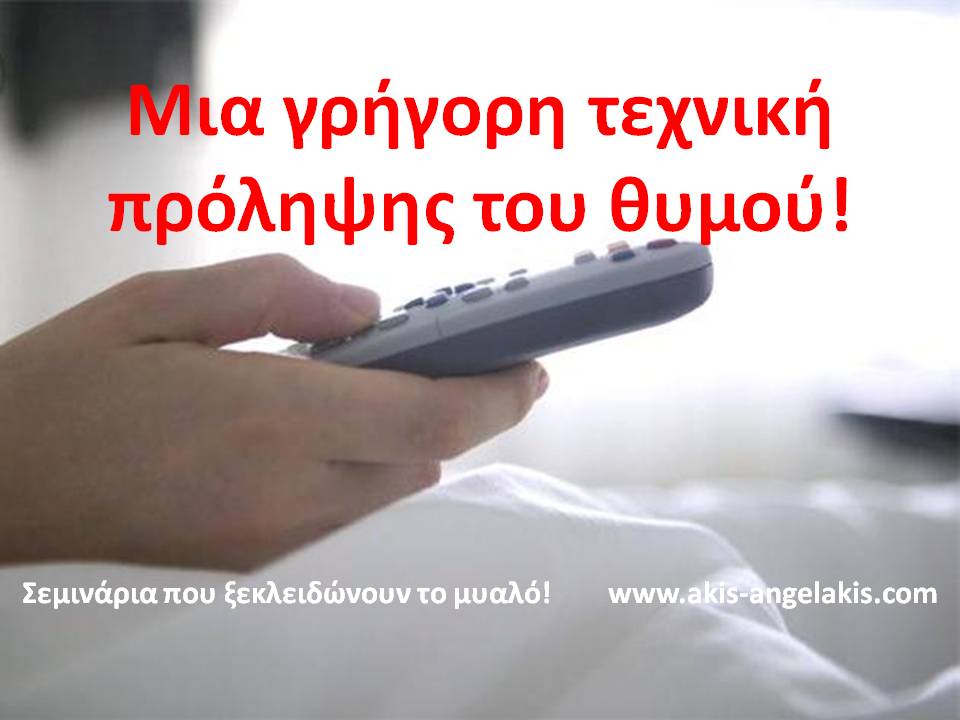 Ένας εύκολος και γρήγορος τρόπος για να παραμένεις ήρεμος εκεί που απαιτείται είναι να οραματίζεσαι κάθε φορά που εκνευρίζεσαι ή θυμώνεις με κάποιον ότι αυτός ο άνθρωπος κρατάει στα χέρια του ένα κοντρόλ (όπως αυτό της τηλεόρασης) και ανάλογα με το ποιο κουμπί θα πατήσει εσύ θα αντιδράσεις.