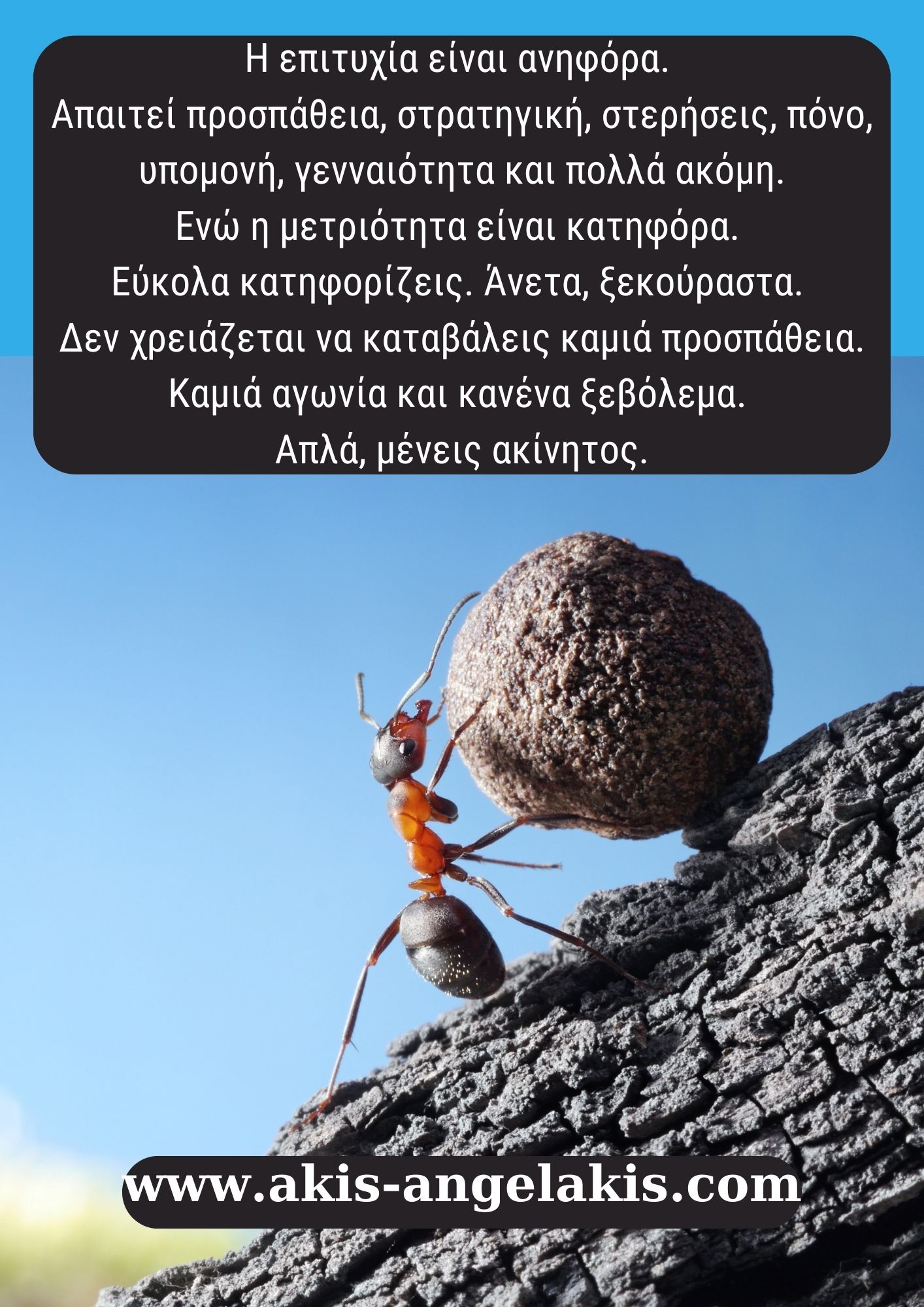Ενώ η μετριότητα είναι κατηφόρα.  Εύκολα κατηφορίζεις.  Άνετα, ξεκούραστα.  Δεν χρειάζεται να καταβάλεις καμιά προσπάθεια. Καμιά αγωνία και κανένα ξεβόλεμα. Απλά, μένεις ακίνητος.