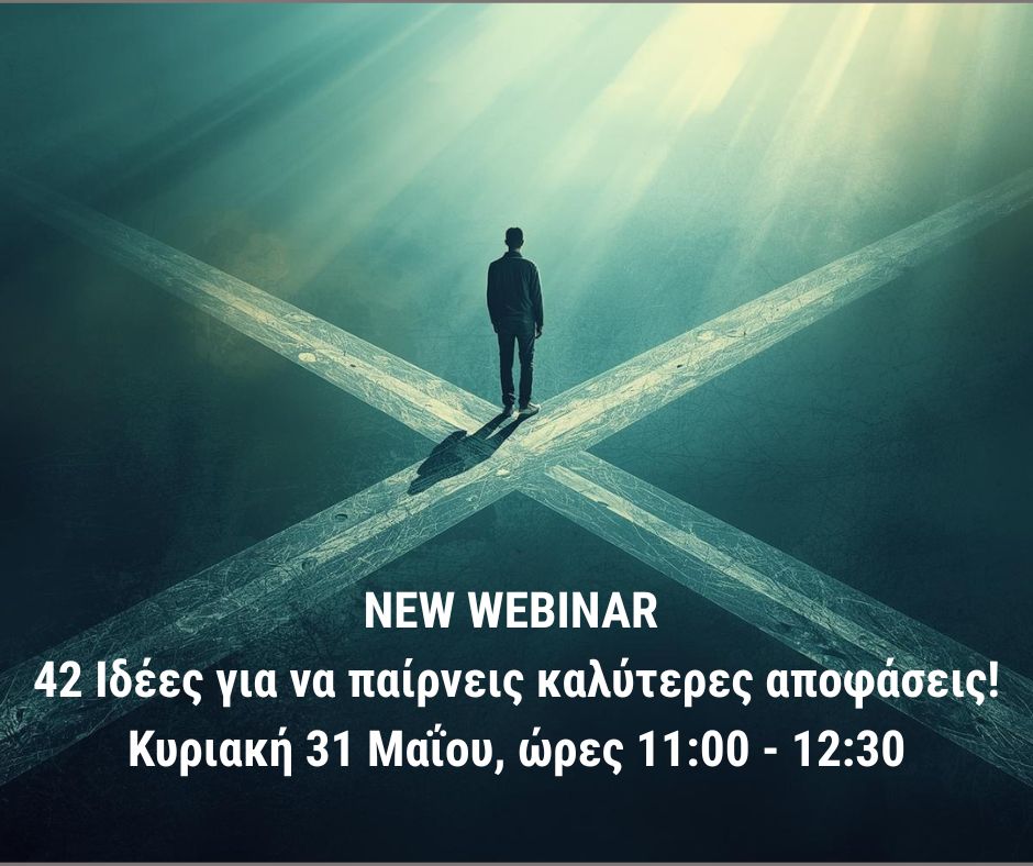 Ζεις σε μια εποχή όπου οι επιλογές είναι πολλές αλλά η καθαρότητα λίγη. Όλο και περισσότεροι άνθρωποι νιώθουν μπερδεμένοι, διστάζουν, καθυστερούν και τελικά μένουν πίσω. Αυτό το webinar δημιουργήθηκε ακριβώς για αυτόν τον λόγο. Δεν είναι ένα ακόμα θεωρητικό webinar. Είναι μια πρακτική, βιωματική διαδικασία που σε βοηθά να ξεκαθαρίσεις το μυαλό σου, να βάλεις σε τάξη τις σκέψεις σου και να μάθεις να παίρνεις αποφάσεις με σιγουριά και εσωτερική δύναμη. Γιατί η αλήθεια είναι απλή. Δεν σε κρατάνε πίσω οι συνθήκες. Σε κρατάει πίσω η αδυναμία να αποφασίσεις. Και αυτό αλλάζει.