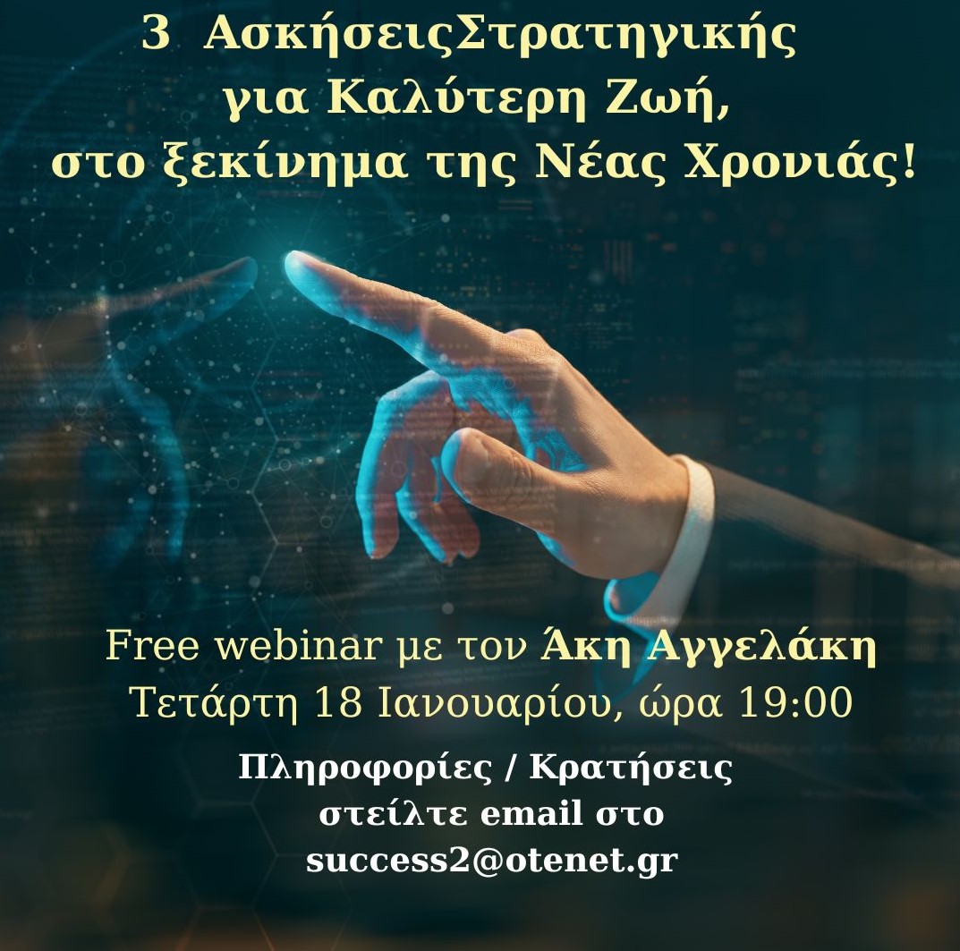 Διεκδίκησε ΤΩΡΑ τη θέση σου στο σεμινάριο 3 Ασκήσεις Στρατηγικής για Καλύτερη Ζωή! Free webinar! & απόκτησε ισχυρό ανταγωνιστικό πλεονέκτημα στην αγορά!
