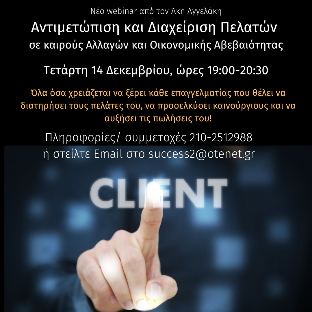 Διεκδίκησε ΤΩΡΑ τη θέση σου στο σεμινάριο Αντιμετώπιση & Διαχείριση πελατών σε περιόδους κρίσης και ύφεσης & απόκτησε ισχυρό ανταγωνιστικό πλεονέκτημα στην αγορά!