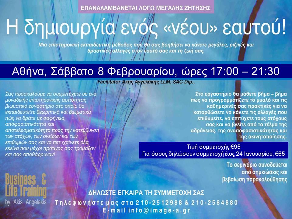 Στόχος σεμιναρίου: Η μεθοδευμένη επίτευξη στόχων και αλλαγών, μέσα από μια συγκεκριμένη σειρά βημάτων που θα παρουσιαστεί θεωρητικά και βιωματικά στους συμμετέχοντες στο σεμινάριο.