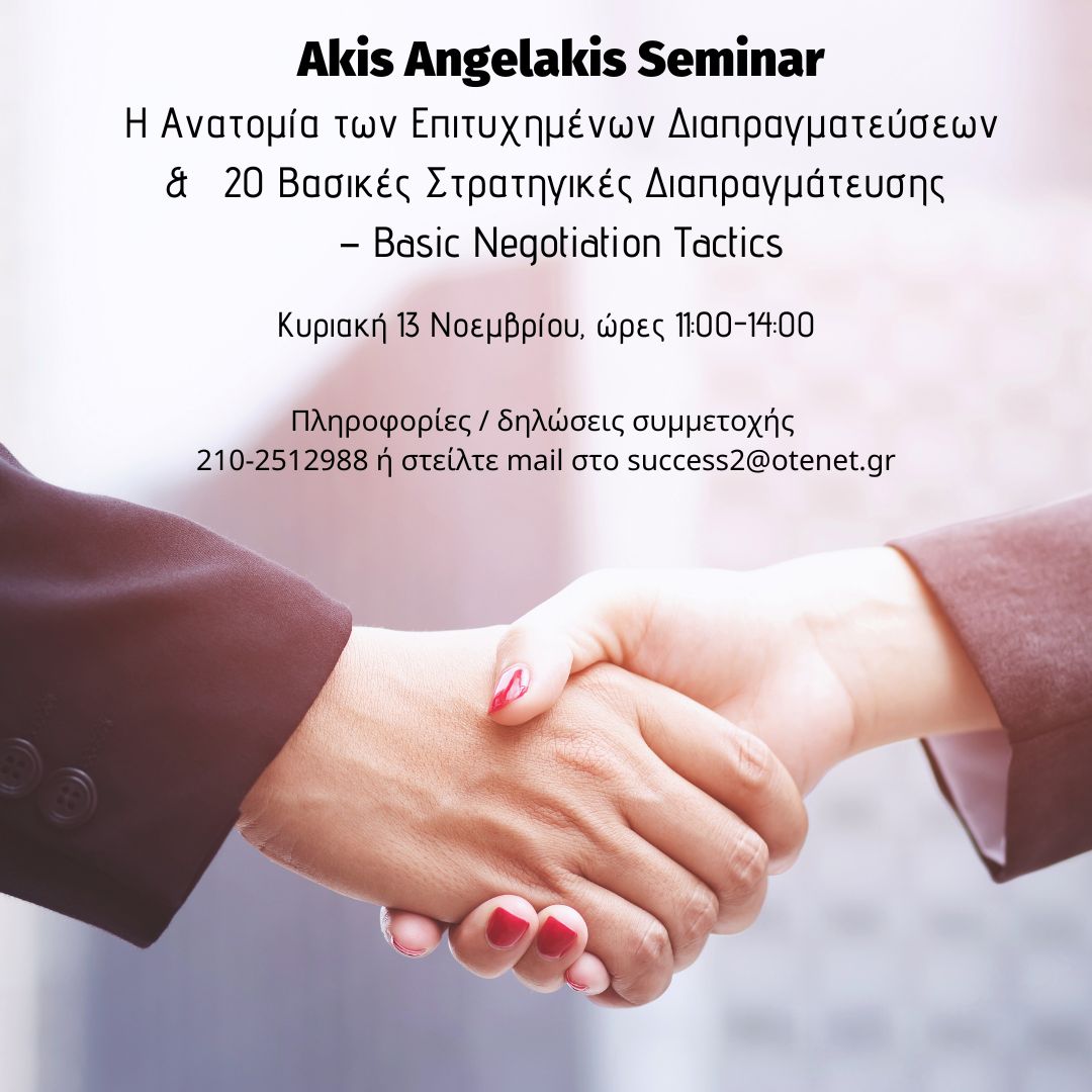 Διεκδίκησε ΤΩΡΑ τη θέση σου στο σεμινάριο Η ανατομία των επιτυχημένων Διαπραγματεύσεων & απόκτησε ισχυρό ανταγωνιστικό πλεονέκτημα στην αγορά!