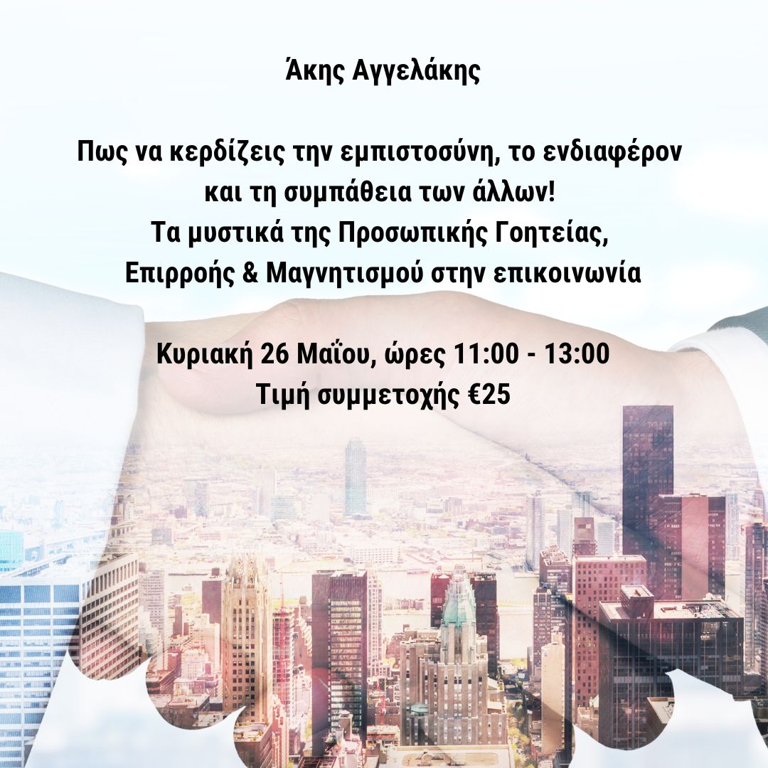 Ένα ξεχωριστό σεμινάριο τεχνικών προσωπικής γοητείας, επιρροής και επικοινωνίας ειδικά σχεδιασμένο για κάθε άνθρωπο και επαγγελματία που θέλει να αυξήσει τη δυναμική του παρουσία κάθε φορά που συναλλάσσεται με πελάτες και γνωρίζεται με νέους ανθρώπους.