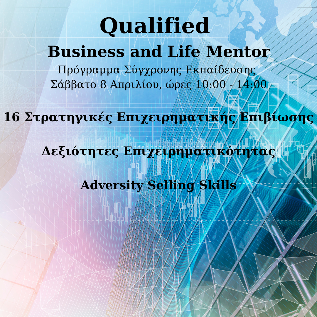 Qualified Business and Life Mentor Πρόγραμμα Σύγχρονης Εκπαίδευσης Σάββατο 8 Απριλίου, ώρες 10:00 – 14:00 16 Στρατηγικές Επιχειρηματικής Επιβίωσης Δεξιότητες Επιχειρηματικότητας Adversity Selling Skills