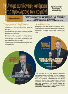 Ένα πλούσιο σε ύλη και ιδιαίτερα επίκαιρο σεμινάριο/ομιλία που μπορεί να γίνει στο χώρο της εταιρίας σας ή στην αίθουσα εκπαίδευσης μας. Το σεμινάριο υποστηρίζεται από εκπαιδευτικά βίντεο και παράλληλα, γίνεται αναφορά στα σπουδαιότερα μηνύματα που έχει να προσφέρει το βιβλίο «ΟΔΗΓΟΣ ΕΠΙΒΙΩΣΗΣ για πωλητές & επαγγελματίες σε περιόδους οικονομικής κρίσης».
