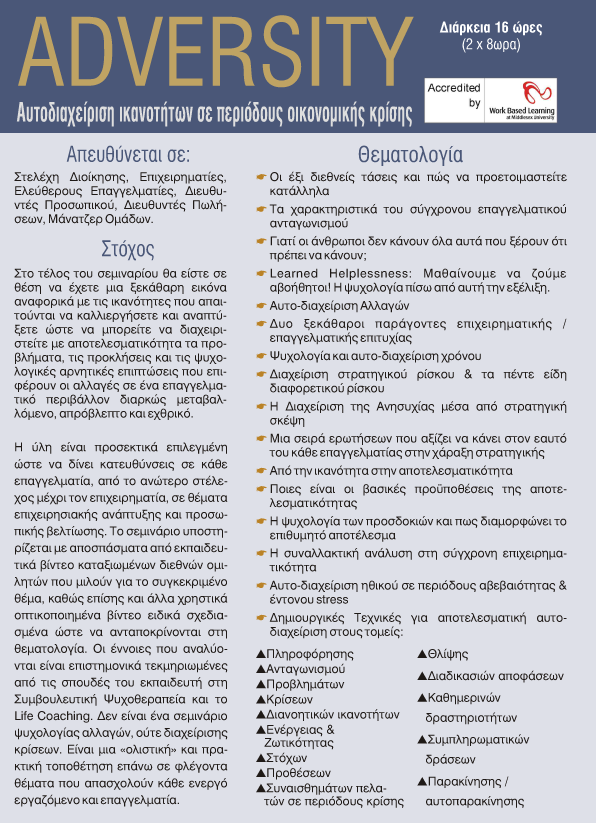 Στο τέλος του σεμιναρίου θα είστε σε θέση να έχετε μια ξεκάθαρη εικόνα αναφορικά με τις ικανότητες που απαιτούνται να καλλιεργήσετε και αναπτύξετε ώστε να μπορείτε να διαχειριστείτε με αποτελεσματικότητα τα προβλήματα, τις προκλήσεις και τις ψυχολογικές αρνητικές επιπτώσεις που επιφέρουν οι αλλαγές σε ένα επαγγελματικό περιβάλλον διαρκώς μεταβαλλόμενο, απρόβλεπτο και εχθρικό.