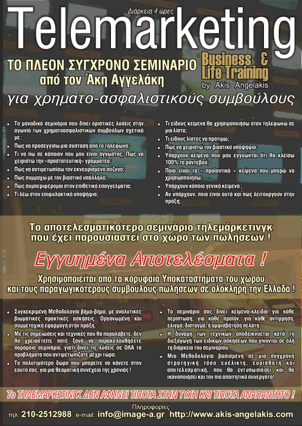 Για το εξαιρετικό σεμινάριο που σας δίνει όλες τις απαντήσεις και τη μέθοδο για να κλείνετε ραντεβού με ποιοτικούς πελάτες, ξεπερνώντας όλες τις αντιρρήσεις που σας λένε!
